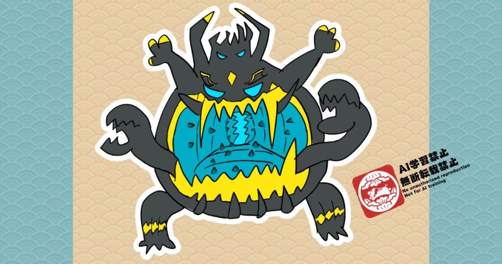 公式画像を引用するのが面倒でしぶしぶおちょこが模写したアクジキング(モデル:公式ポケモンずかんサイト)